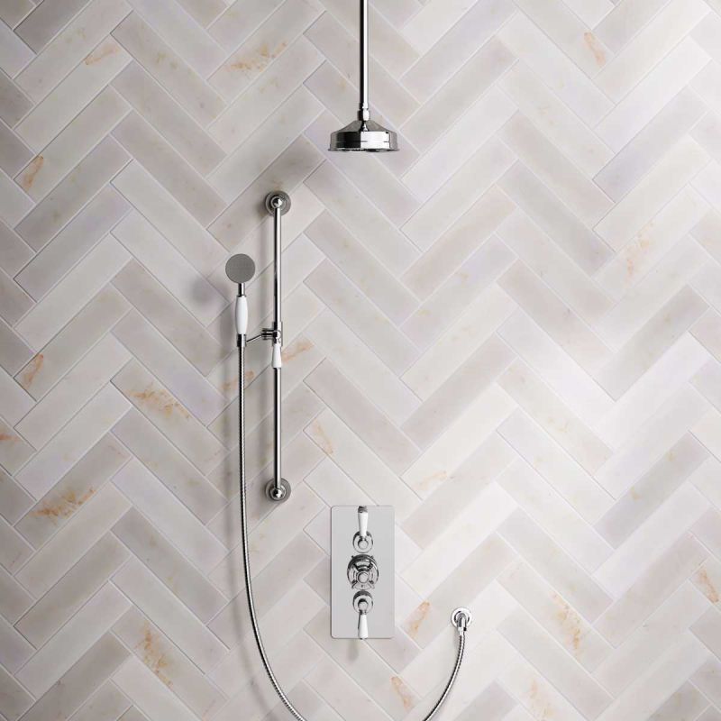 Linton Dual Outlet Concealed Shower with Slider Rail, 210mm Ceiling Arm & 6" Rose - White Lever - Chrome