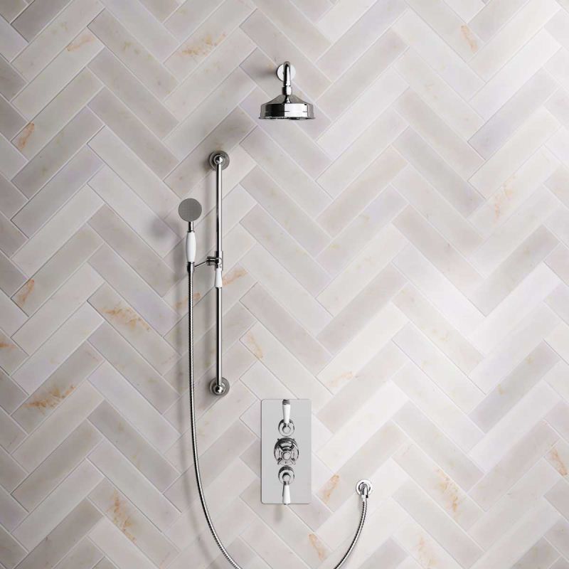 The Ashbee and Stone Chrome Finish Concealed Dual Outlet Shower Valve with Shower Arm and Diverter Handshower mounted onto Slider-Rail. Shower is supplied with White Ceramic Levers and an 6 inch apron rose.