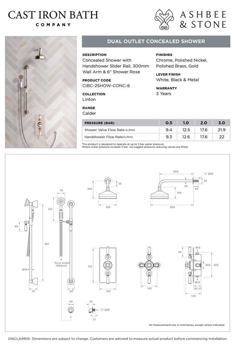 View Handshower on Slider Rail, 300mm Wall Arm & 6 Inch Rose specification sheet