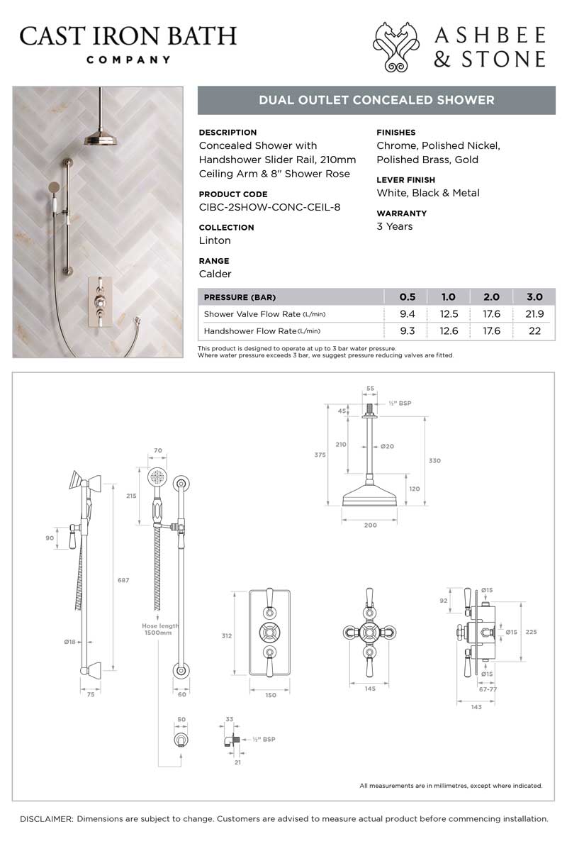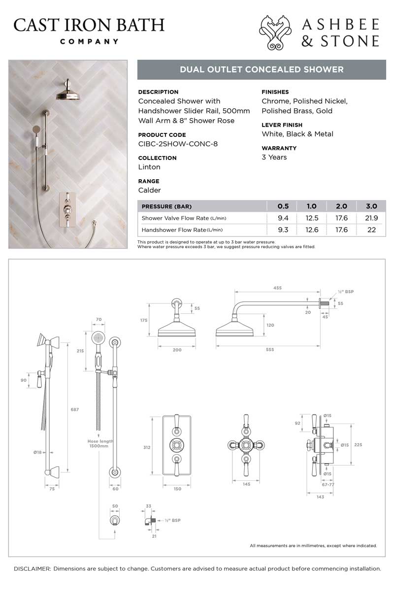 View Handshower on Slider Rail, 500mm Wall Arm & 8 Inch Rose specification sheet