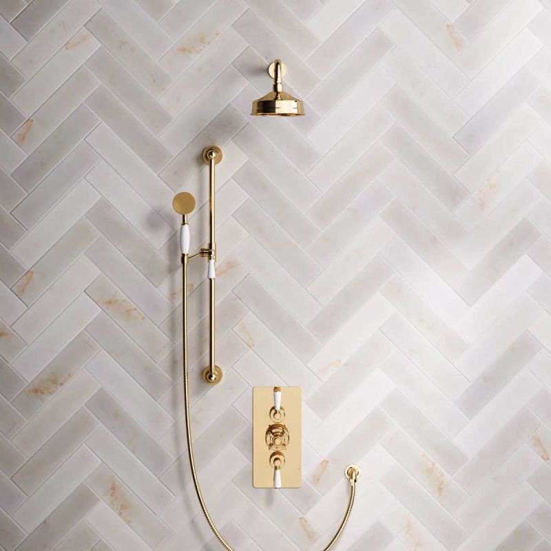 Linton Dual Outlet Concealed Shower with Slider Rail, 300mm Wall Arm & 6" Rose - White Lever - Living Brass