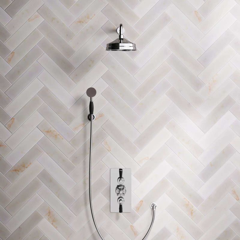 The Ashbee and Stone Chrome Finish Concealed Dual Outlet Shower Valve with Shower Arm and Diverter Handshower mounted onto a Hook. Shower is supplied with Black Ceramic Levers and an 8 inch apron rose.