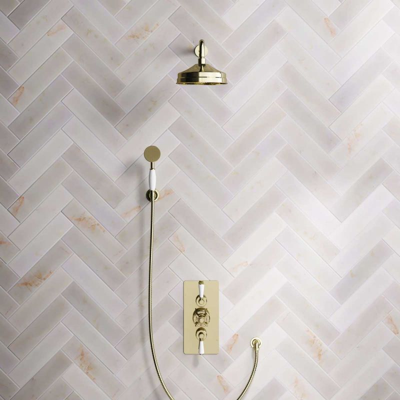 Linton Dual Outlet Concealed Shower with Handshower Hook, 500mm Wall Arm & 8" Rose - White Lever - Timeless Brass