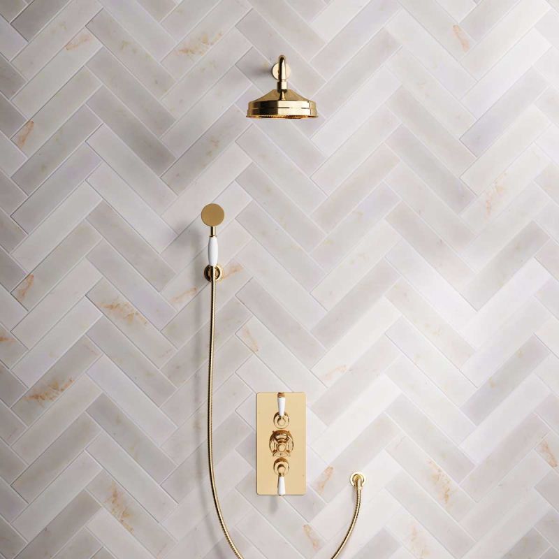 Linton Dual Outlet Concealed Shower with Handshower Hook, 500mm Wall Arm & 8" Rose - White Lever - Living Brass