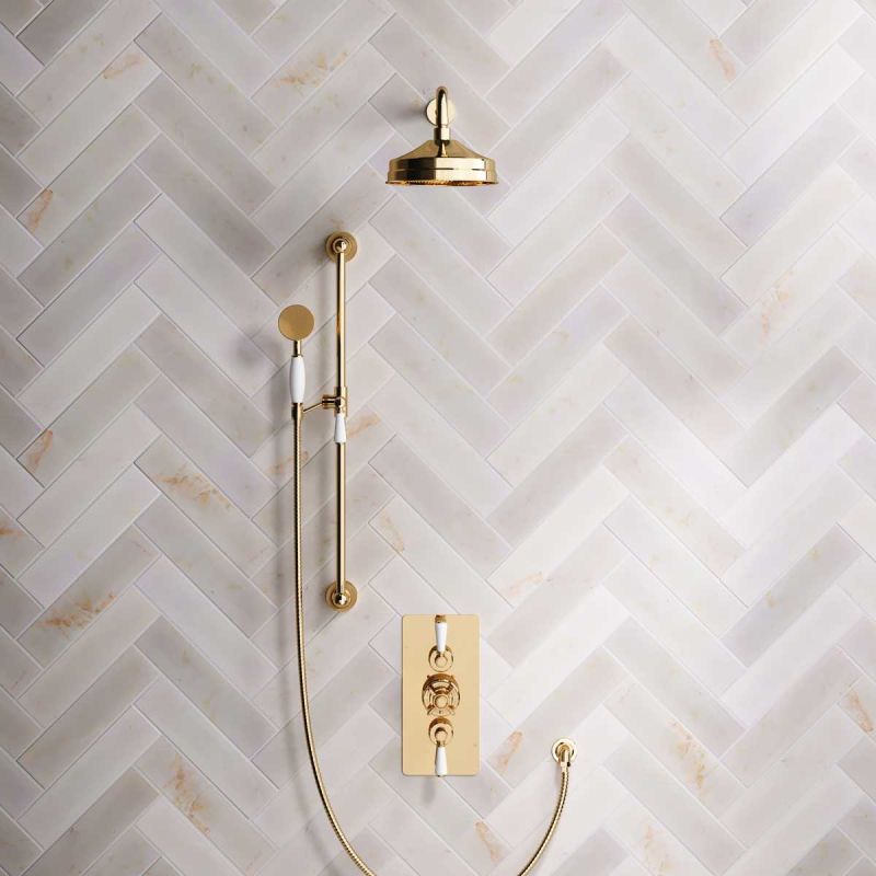 The Ashbee and Stone Living Brass Concealed Dual Outlet Shower Valve with Shower Arm and Diverter Handshower mounted onto Slider-Rail. Shower is supplied with White Ceramic Levers and an 8 inch apron rose.