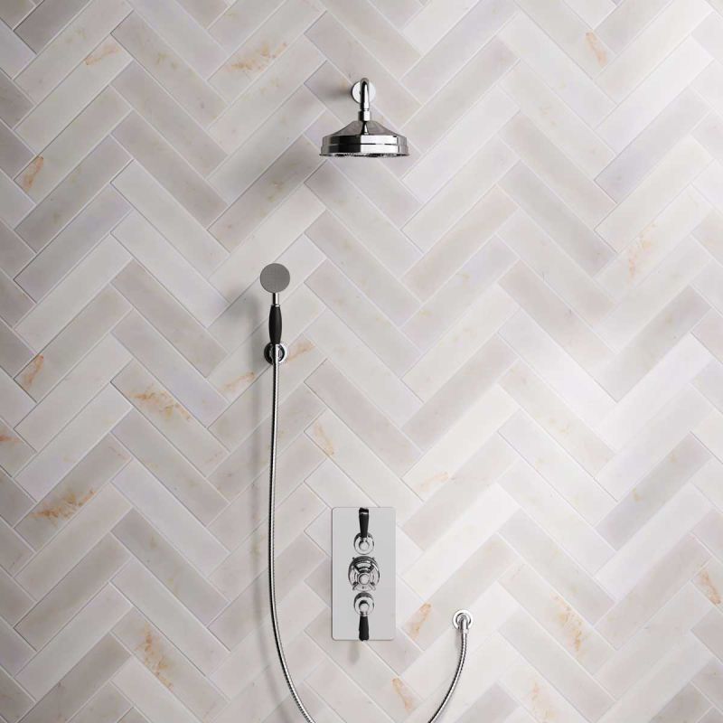 The Ashbee and Stone Chrome Finish Concealed Dual Outlet Shower Valve with Shower Arm and Diverter Handshower mounted onto a Hook. Shower is supplied with Black Ceramic Levers and an 8 inch apron rose.