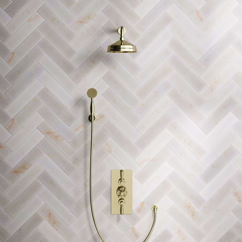 Inspired by Edwardian period showerware, Ashbee and Stone offer this beautifully finished concealed dual outlet shower set in Timeless Brass.
