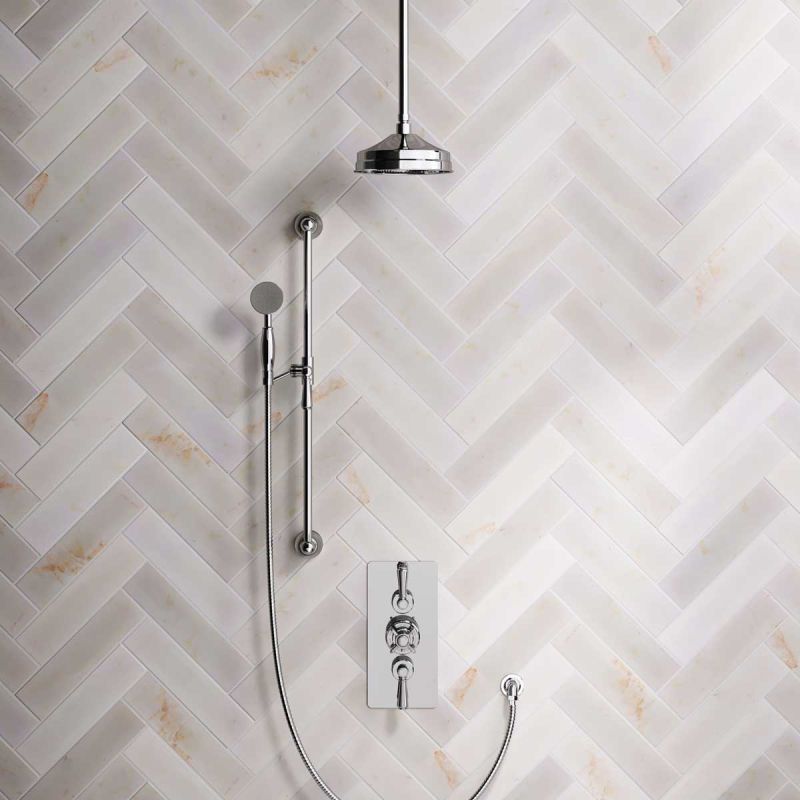 The Ashbee and Stone Chrome Finish Concealed Dual Outlet Shower Valve with Shower Arm and Diverter Handshower mounted onto a Slider-Rail. Shower is supplied with Metal Levers and an 8 inch apron rose.