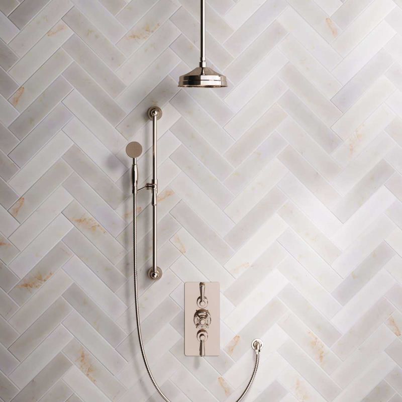 Inspired by Edwardian period showerware, Ashbee and Stone offer this beautifully finished concealed dual outlet shower set in Polished Nickel.
