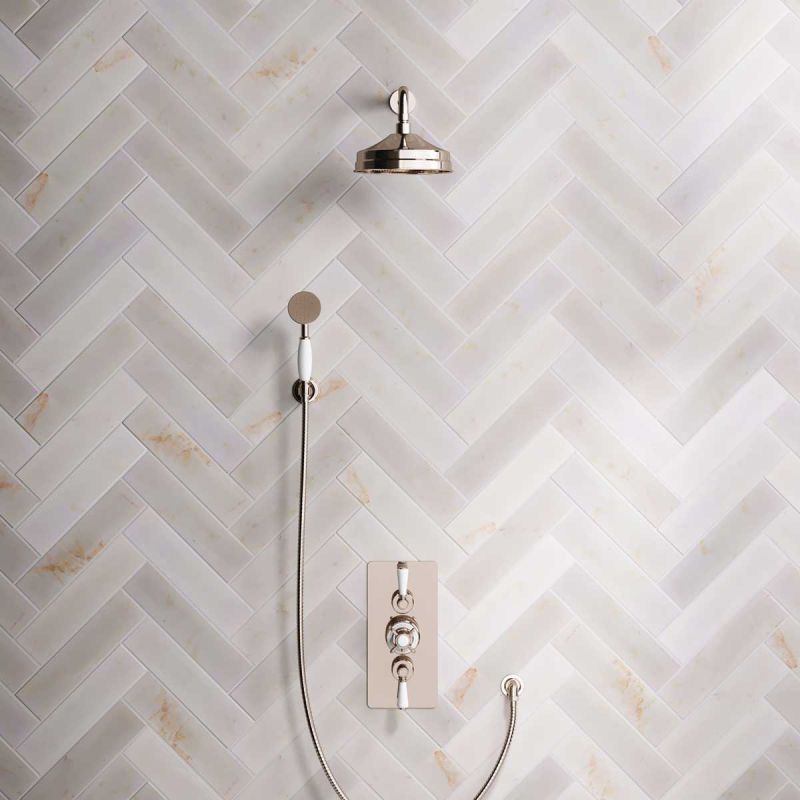 The Ashbee and Stone Polished Nickel Concealed Dual Outlet Shower Valve with Shower Arm and Diverter Handshower mounted onto Hook. Shower is supplied with White Ceramic Levers and an 8 inch apron rose.