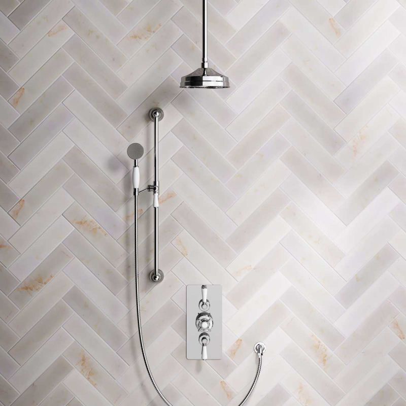 The Ashbee and Stone Chrome Finish Concealed Dual Outlet Shower Valve with Shower Arm and Diverter Handshower mounted onto Slider-Rail. Shower is supplied with White Ceramic Levers and an 8 inch apron rose.