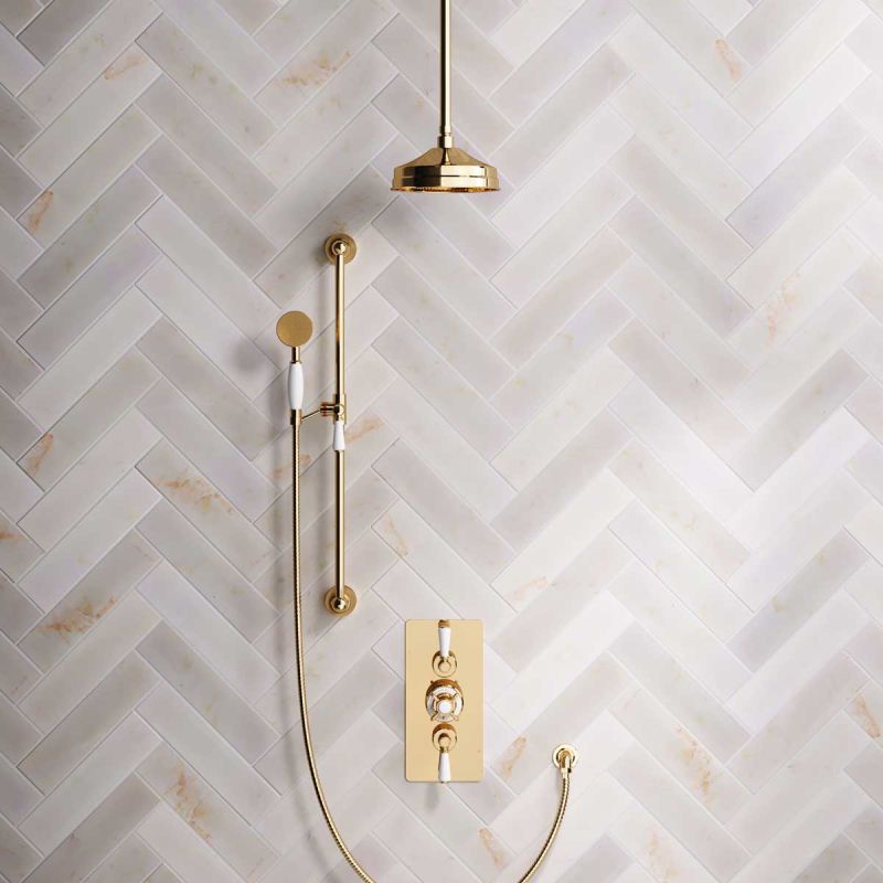 The Ashbee and Stone Polished Brass Concealed Dual Outlet Shower Valve with Shower Arm and Diverter Handshower mounted onto Slider-Rail. Shower is supplied with White Ceramic Levers and an 8 inch apron rose.
