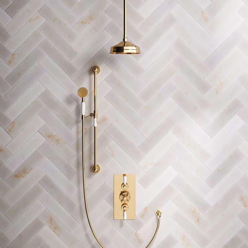 The Ashbee and Stone Living Brass Concealed Dual Outlet Shower Valve with Shower Arm and Diverter Handshower mounted onto Slider-Rail. Shower is supplied with White Ceramic Levers and an 8 inch apron rose.