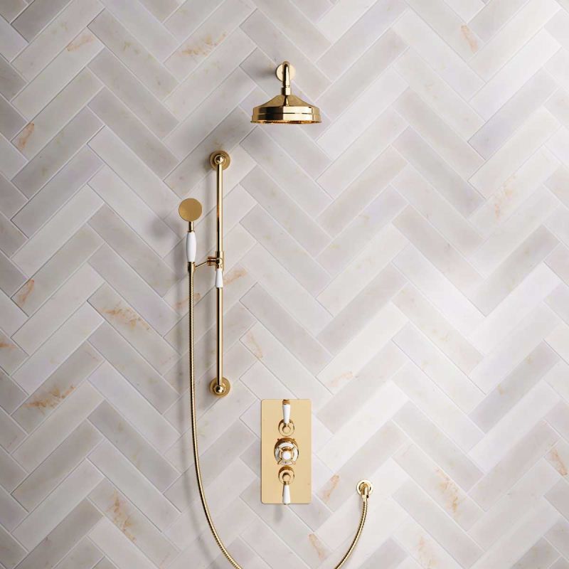 The Ashbee and Stone Polished Brass Concealed Dual Outlet Shower Valve with Shower Arm and Diverter Handshower mounted onto Slider-Rail. Shower is supplied with White Ceramic Levers and an 8 inch apron rose.