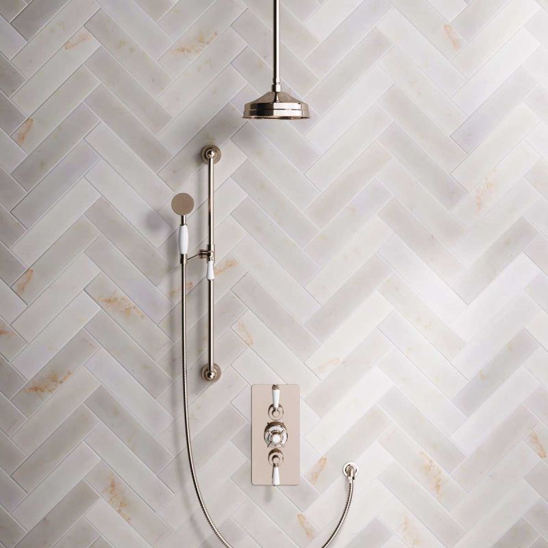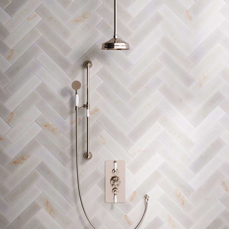 The Ashbee and Stone Polished Nickel Concealed Dual Outlet Shower Valve with Shower Arm and Diverter Handshower mounted onto Slider-Rail. Shower is supplied with White Ceramic Levers and an 8 inch apron rose.