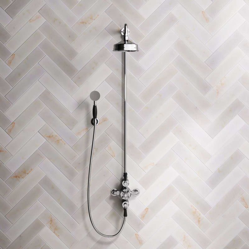 The Ashbee and Stone Chrome Finish Exposed Dual Outlet Shower Valve with Riser Rail, Shower Arm and Diverter Handshower mounted onto a Hook. Shower is supplied with Black Ceramic Levers and an 6 inch apron rose.