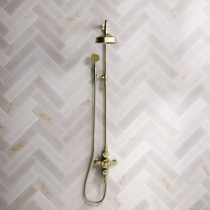 Inspired by Edwardian period showerware, Ashbee and Stone offer this beautifully finished exposed dual outlet shower set in Timeless Brass.