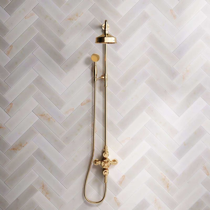 Inspired by Edwardian period showerware, Ashbee and Stone offer this beautifully finished exposed dual outlet shower set in Living Brass.