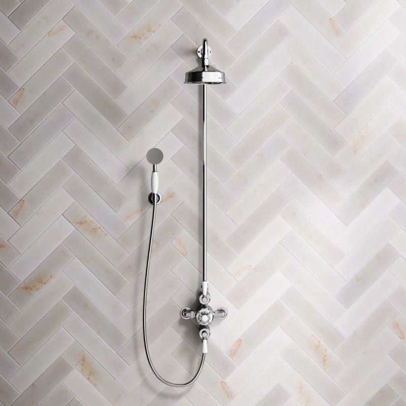 The Ashbee and Stone Chrome Finish Exposed Dual Outlet Shower Valve with Riser Rail, Shower Arm and Diverter Handshower mounted onto a Hook. Shower is supplied with White Ceramic Levers and an 6 inch apron rose.