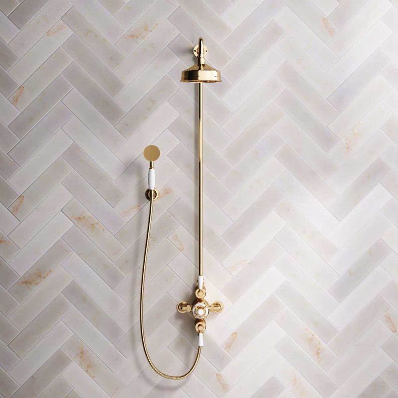 Inspired by Edwardian period showerware, Ashbee and Stone offer this beautifully finished exposed dual outlet shower set in Polished Brass.