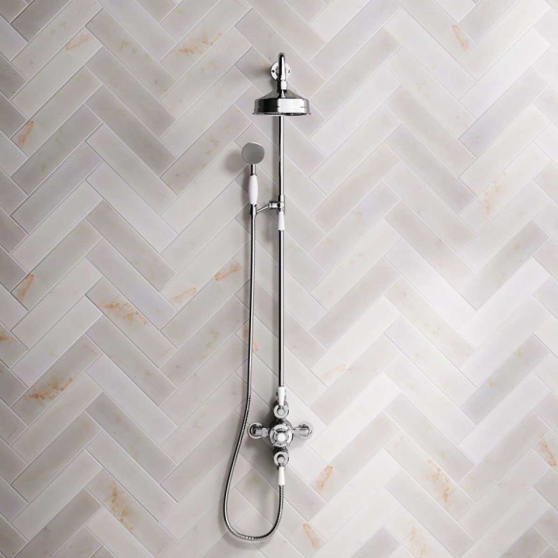 The Ashbee and Stone Chrome Finish Exposed Dual Outlet Shower Valve with Riser Rail, Shower Arm and Diverter Handshower mounted onto the Riser-Rail. Shower is supplied with White Ceramic Levers and an 6 inch apron rose.