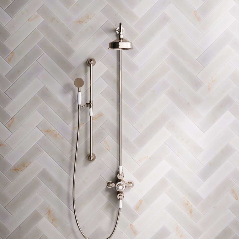 The Ashbee and Stone Polished Nickel Exposed Dual Outlet Shower Valve with Riser Rail, Shower Arm and Diverter Handshower mounted onto a Slider-Rail. Shower is supplied with White Ceramic Levers and an 6 inch apron rose.