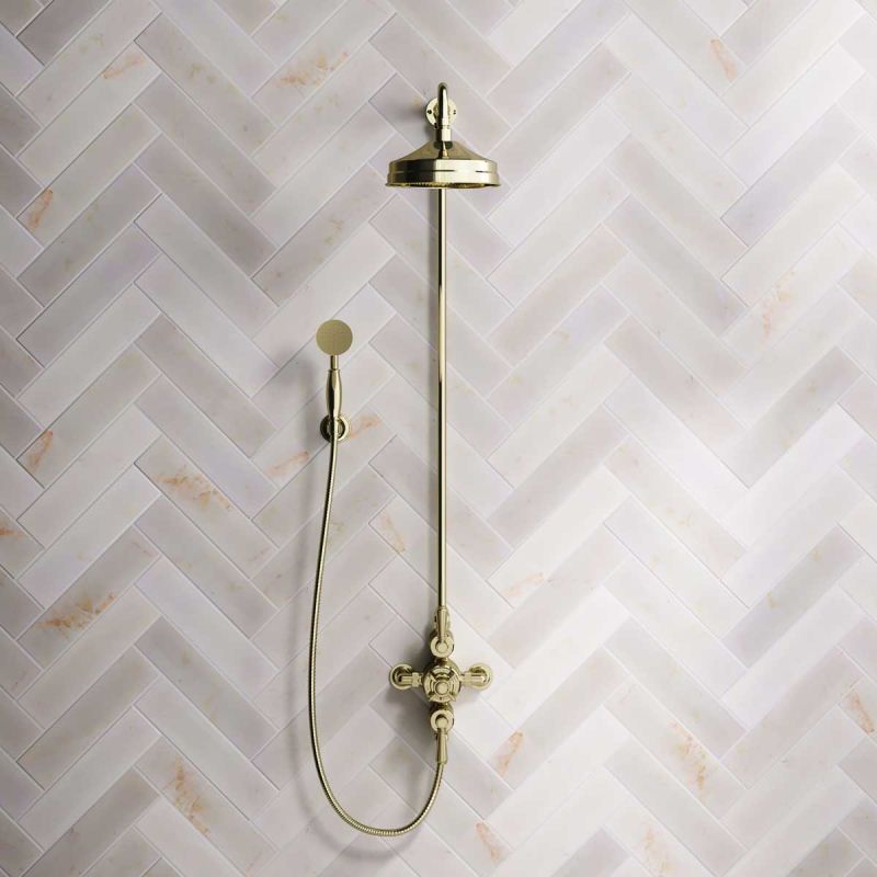 Inspired by Edwardian period showerware, Ashbee and Stone offer this beautifully finished exposed dual outlet shower set in Timeless Brass.