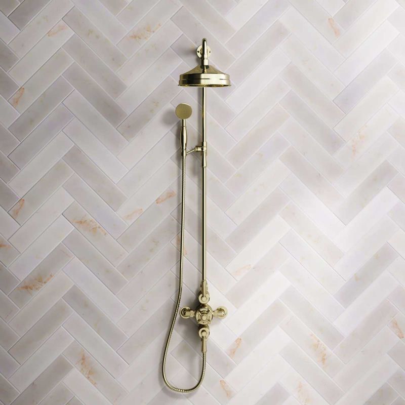 Inspired by Edwardian period showerware, Ashbee and Stone offer this beautifully finished exposed dual outlet shower set in Timeless Brass.