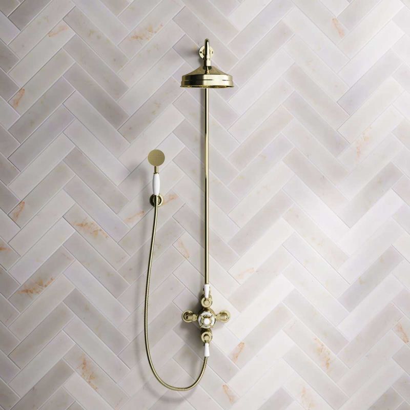 The Ashbee and Stone Gold Exposed Dual Outlet Shower Valve with Riser Rail, Shower Arm and Diverter Handshower mounted onto a Hook. Shower is supplied with White Ceramic Levers and an 8 inch apron rose.