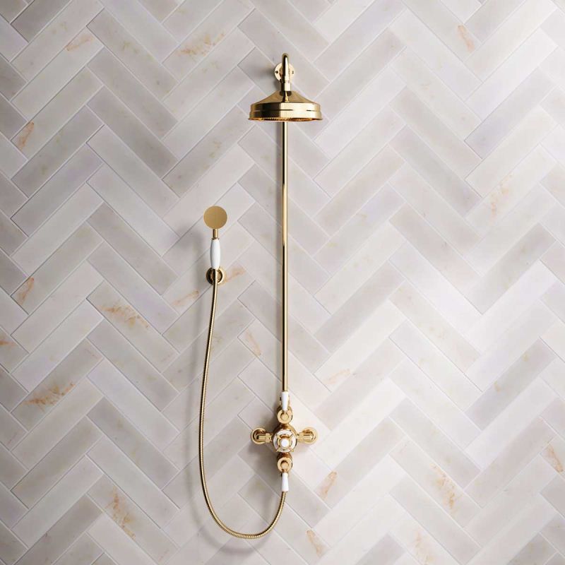 The Ashbee and Stone Polished Brass Exposed Dual Outlet Shower Valve with Riser Rail, Shower Arm and Diverter Handshower mounted onto a Hook. Shower is supplied with White Ceramic Levers and an 8 inch apron rose.