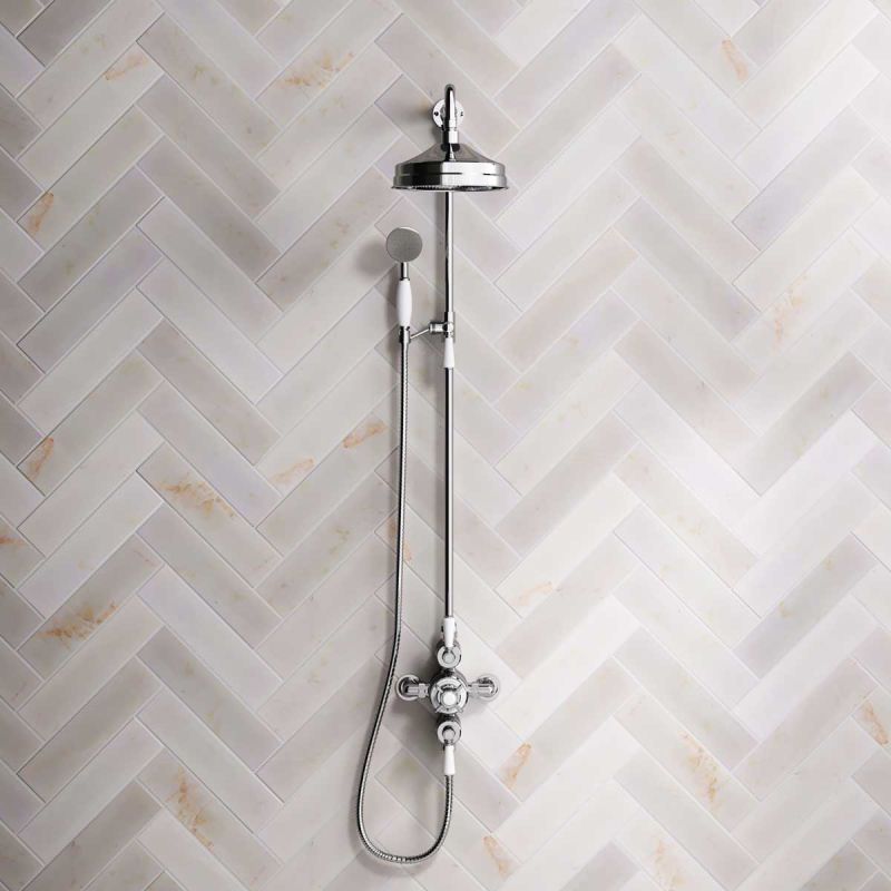 The Ashbee and Stone Chrome Finish Exposed Dual Outlet Shower Valve with Riser Rail, Shower Arm and Diverter Handshower mounted onto the Riser-Rail. Shower is supplied with White Ceramic Levers and an 8 inch apron rose.