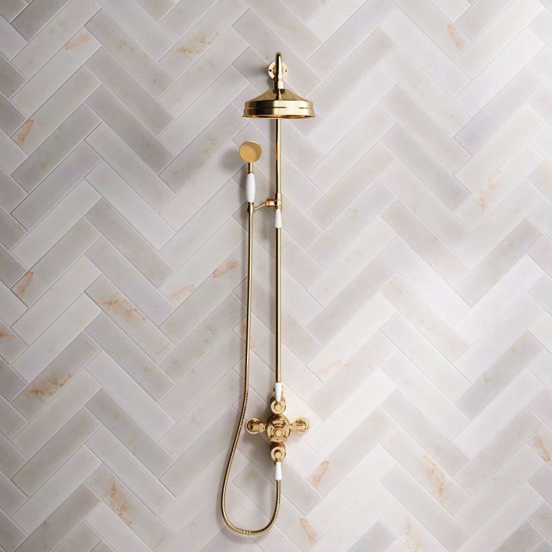 Inspired by Edwardian period showerware, Ashbee and Stone offer this beautifully finished exposed dual outlet shower set in Living Brass.