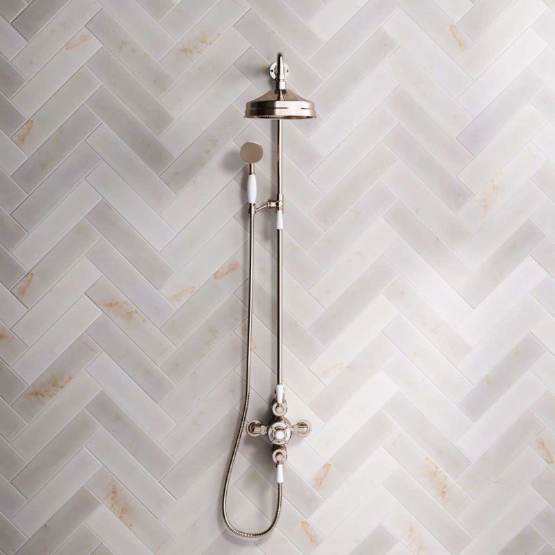 Inspired by Edwardian period showerware, Ashbee and Stone offer this beautifully finished exposed dual outlet shower set in Polished Nickel.