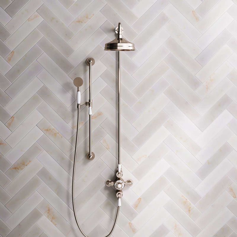 The Ashbee and Stone Polished Nickel Exposed Dual Outlet Shower Valve with Riser Rail, Shower Arm and Diverter Handshower mounted onto a Slider-Rail. Shower is supplied with White Ceramic Levers and an 8 inch apron rose.