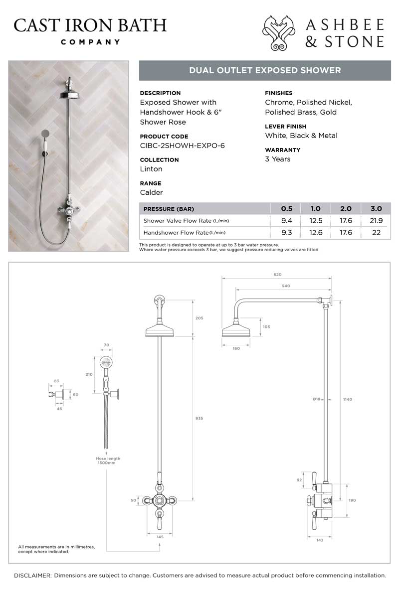 The valve. Machined from solid brass, is fitted with a German engineered ceramic thermostatic cartridge, metal indicator bezel, cross head temperature controller and porcelain operation levers. The shower set is completed with a riser rail, shower arm and apron shower rose. The handshower is mounted onto a Hook. Matches perfectly with our Asygarth and Linton ranges of taps.