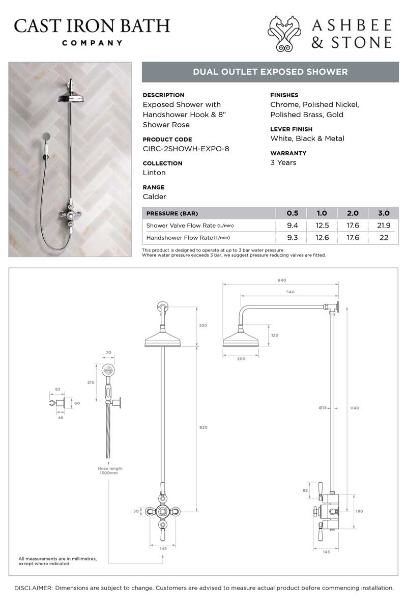 All Ashbee and Stone showers have a minimum working pressure of 0.5 BAR and a maximum working pressure of 5 BAR. Available in a choice of Chrome, Polished Nickel and Polished Brass finishes.