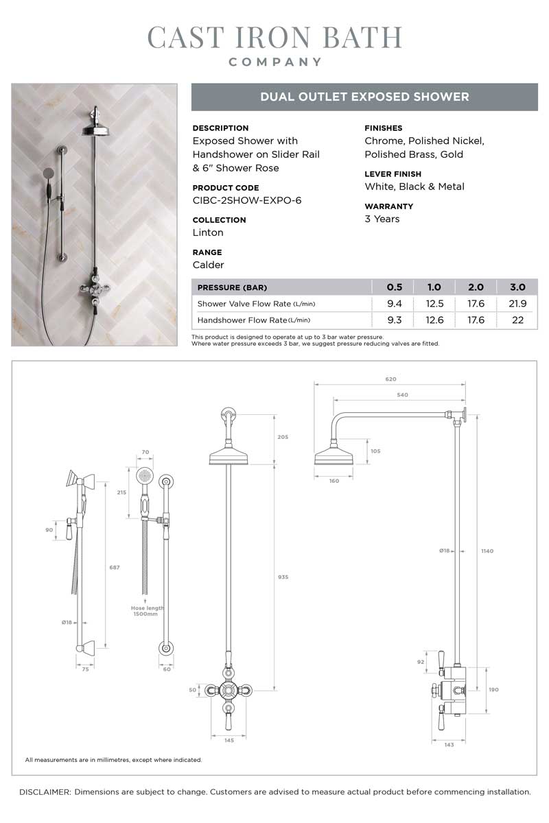 The valve. Machined from solid brass, is fitted with a German engineered ceramic thermostatic cartridge, metal indicator bezel, cross head temperature controller and porcelain operation levers. The shower set is completed with a riser rail, shower arm and apron shower rose. The handshower is mounted onto the Riser-Rail. Matches perfectly with our Asygarth and Linton ranges of taps.
