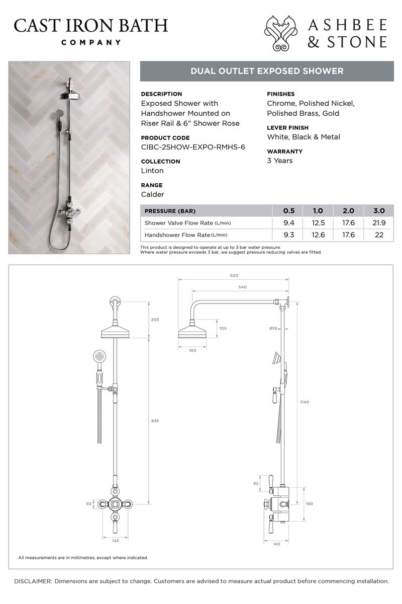 The valve. Machined from solid brass, is fitted with a German engineered ceramic thermostatic cartridge, ceramic indicator bezel, cross head temperature controller and porcelain operation levers. The shower set is completed with a riser rail, shower arm and apron shower rose. The handshower is mounted onto the Riser-Rail. Matches perfectly with our Asygarth and Linton ranges of taps.