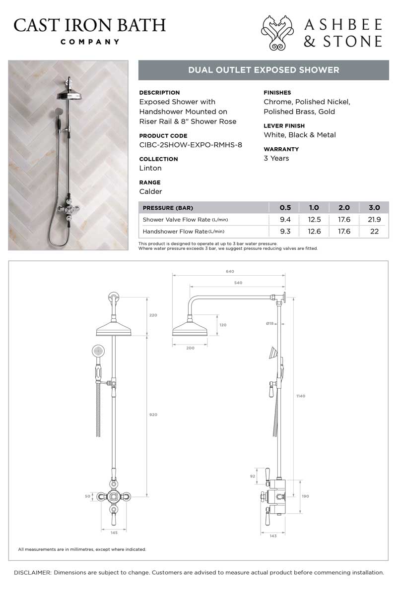 All Ashbee and Stone showers have a minimum working pressure of 0.5 BAR and a maximum working pressure of 5 BAR. Available in a choice of Chrome, Polished Nickel and Polished Brass finishes.