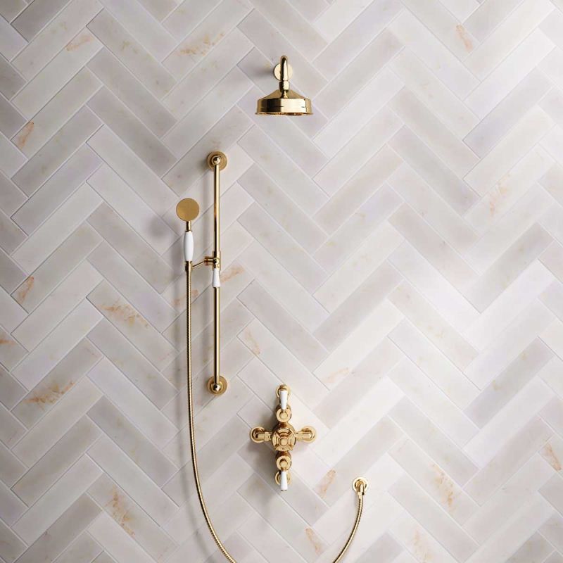 The valve. Machined from solid brass, is fitted with a German engineered ceramic thermostatic cartridge, ceramic indicator bezel, cross head temperature controller, porcelain operation levers and is faced with brass cover plate. The shower set is completed with shower arm and 6 inch apron shower rose. The handshower is mounted onto a Slider-Rail. Matches perfectly with our Asygarth and Linton ranges of taps.