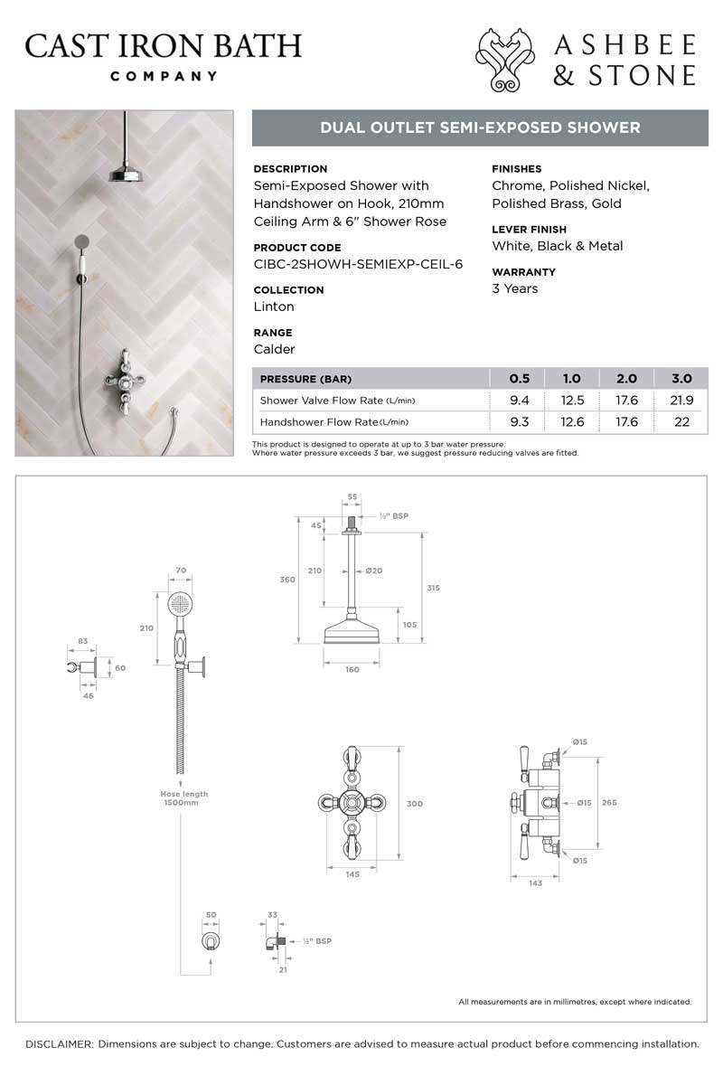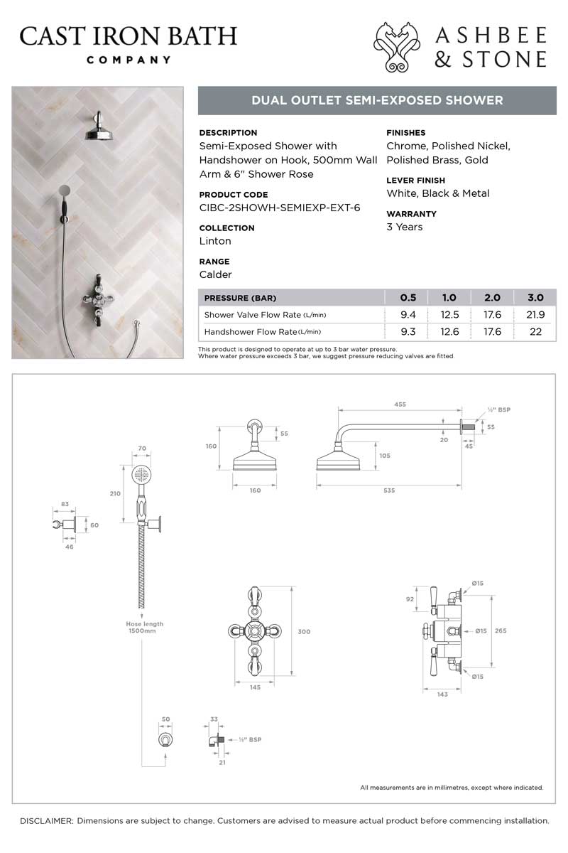 View Handshower on Hook, 500mm Wall Arm & 6 Inch Rose specification sheet