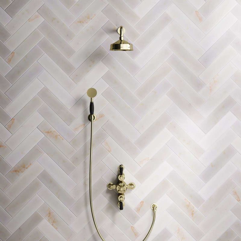 Inspired by Edwardian period showerware, Ashbee and Stone offer this beautifully finished semi-exposed dual outlet shower set in Timeless Brass.