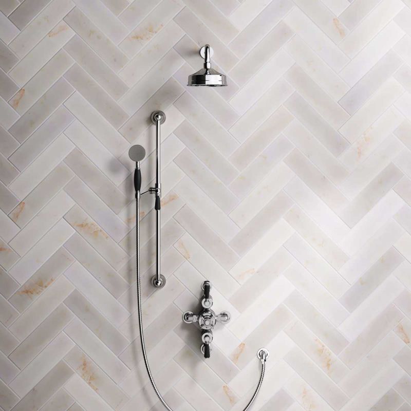 The Ashbee and Stone Chrome Finish Semi-Exposed Dual Outlet Shower Valve with Shower Arm and Diverter Handshower mounted onto a Slider-Rail. Shower is supplied with Black Ceramic Levers and an 6 inch apron rose.