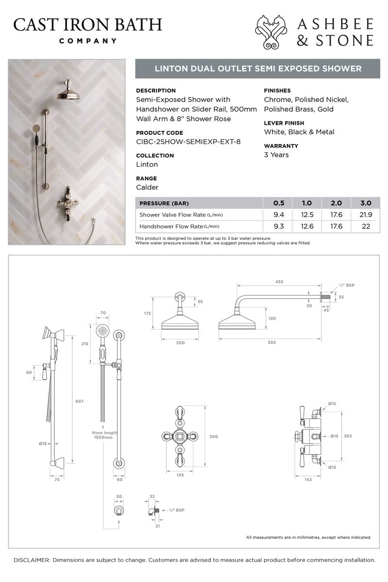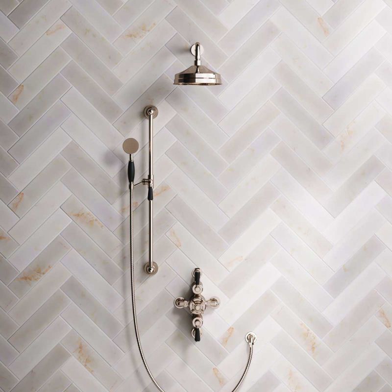All Ashbee and Stone showers have a minimum working pressure of 0.5 BAR and a maximum working pressure of 5 BAR. Available in a choice of Chrome, Polished Nickel and Polished Brass finishes.
