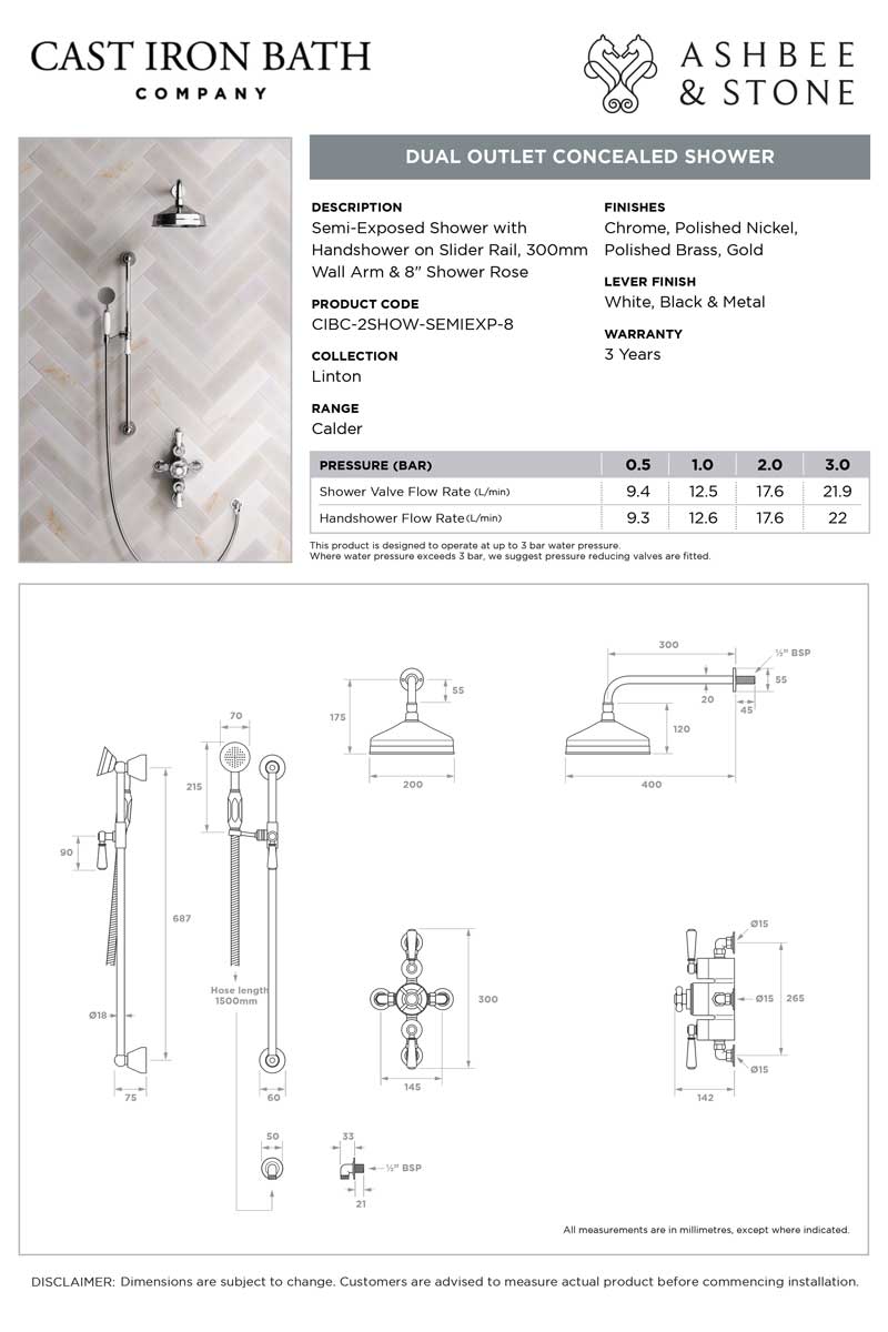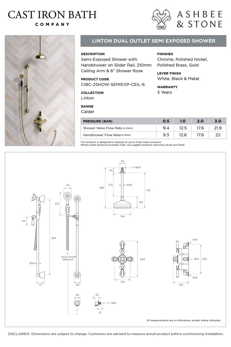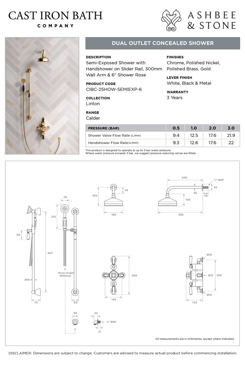 The valve. Machined from solid brass, is fitted with a German engineered ceramic thermostatic cartridge, metal indicator bezel, cross head temperature controller, porcelain operation levers and is faced with brass cover plate. The shower set is completed with shower arm and apron shower rose. The handshower is mounted onto a Slider-Rail. Matches perfectly with our Asygarth and Linton ranges of taps.
