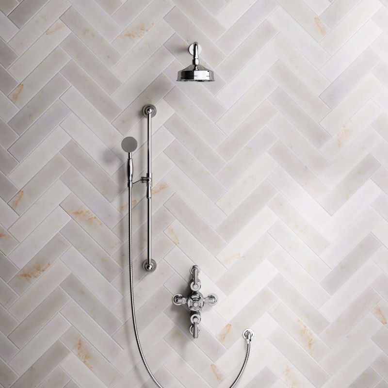 The Ashbee and Stone Chrome Finish Semi-Exposed Dual Outlet Shower Valve with Shower Arm and Diverter Handshower mounted onto a Slider-Rail. Shower is supplied with Metal Levers and an 6 inch apron rose.