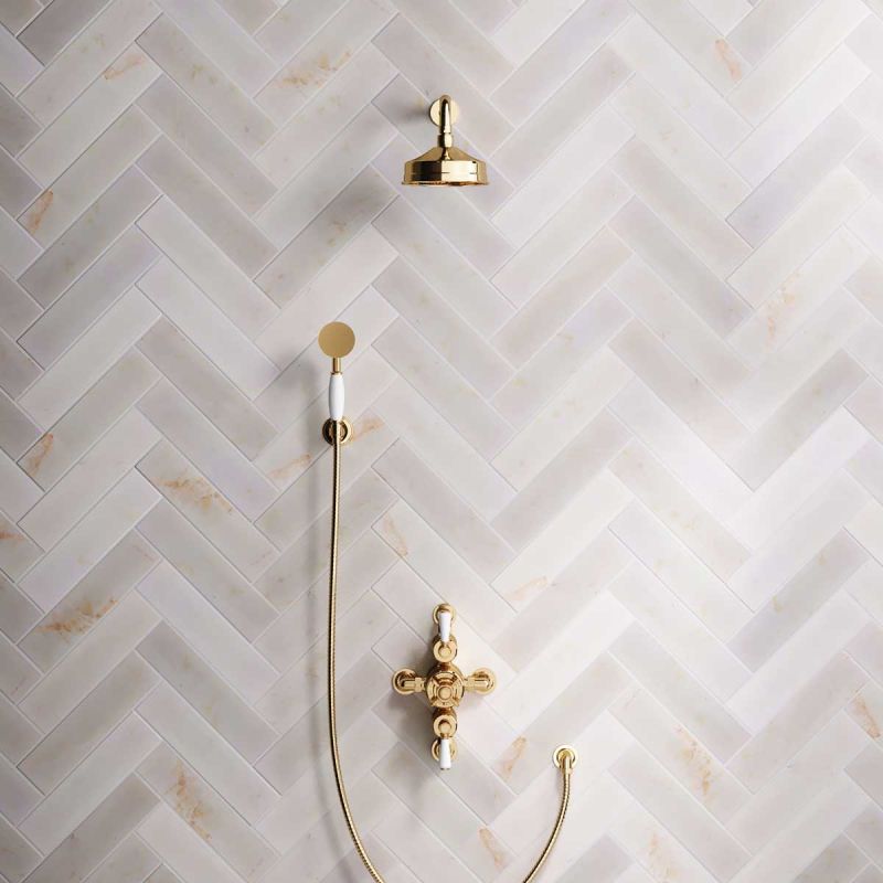 The Ashbee and Stone Living Brass Semi-Exposed Dual Outlet Shower Valve with Shower Arm and Diverter Handshower mounted onto Hook. Shower is supplied with White Ceramic Levers and an 6 inch apron rose.