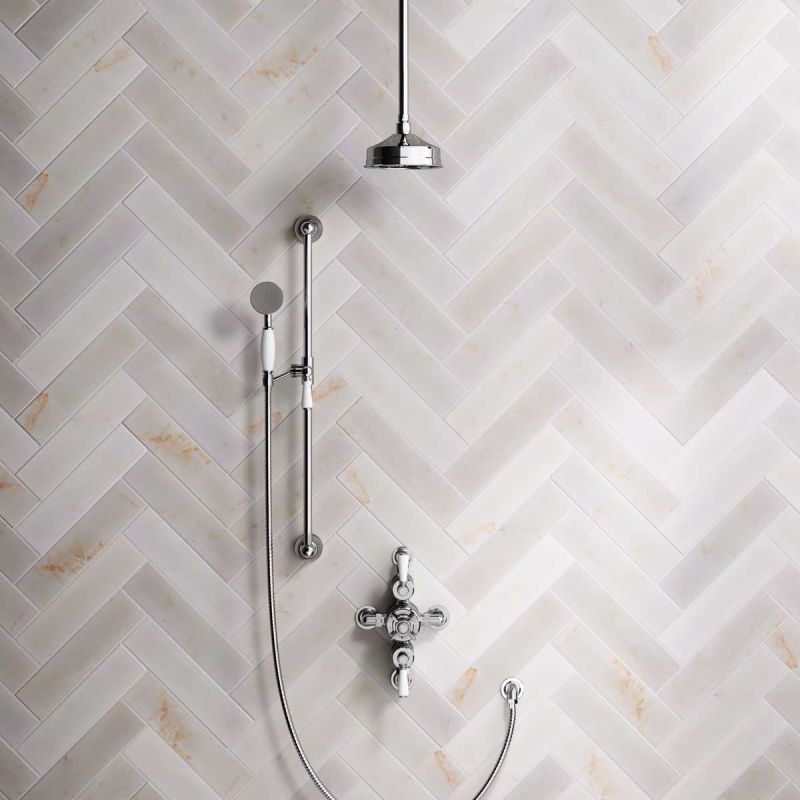 The Ashbee and Stone Chrome Finish Semi-Exposed Dual Outlet Shower Valve with Shower Arm and Diverter Handshower mounted onto Slider-Rail. Shower is supplied with White Ceramic Levers and an 6 inch apron rose.