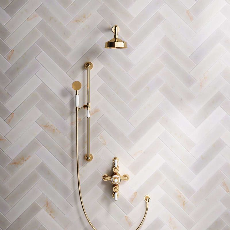 The Ashbee and Stone Polished Brass Semi-Exposed Dual Outlet Shower Valve with Shower Arm and Diverter Handshower mounted onto Slider-Rail. Shower is supplied with White Ceramic Levers and an 6 inch apron rose.