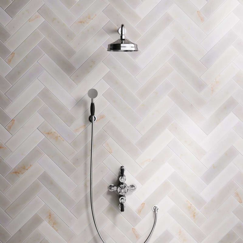 The Ashbee and Stone Chrome Finish Semi-Exposed Dual Outlet Shower Valve with Shower Arm and Diverter Handshower mounted onto a Hook. Shower is supplied with Black Ceramic Levers and an 8 inch apron rose.